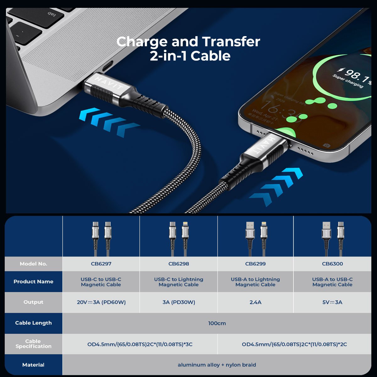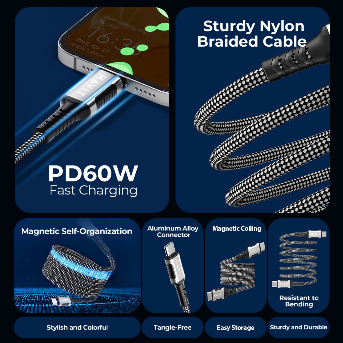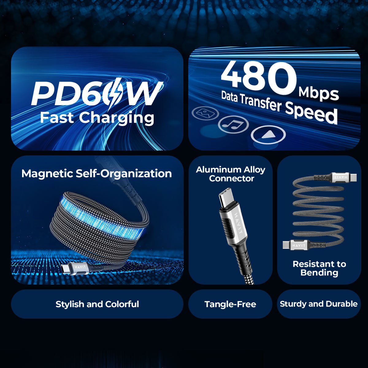 Tired of tangled cables and slow charging? Elevate your charging experience with the Havit 60W Magnetic Charging Cable – the ultimate solution for speed, organization, and durability!