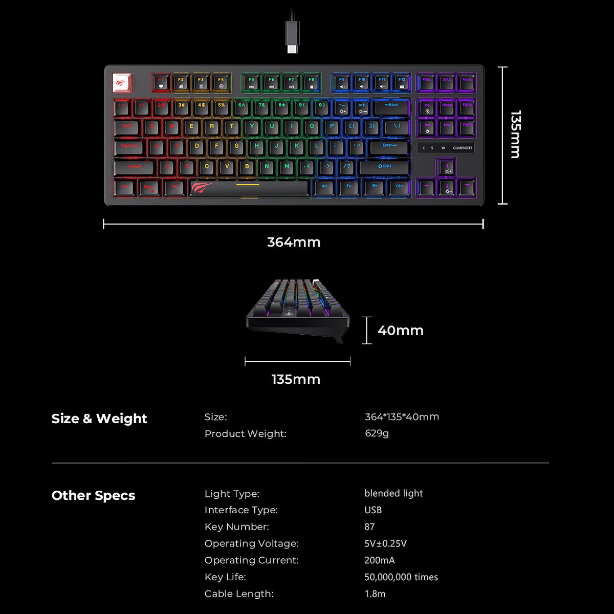 Havit KB892L 87-Key Mechanical Gaming Keyboard | RGB Backlit | Blue Switch | Type-C