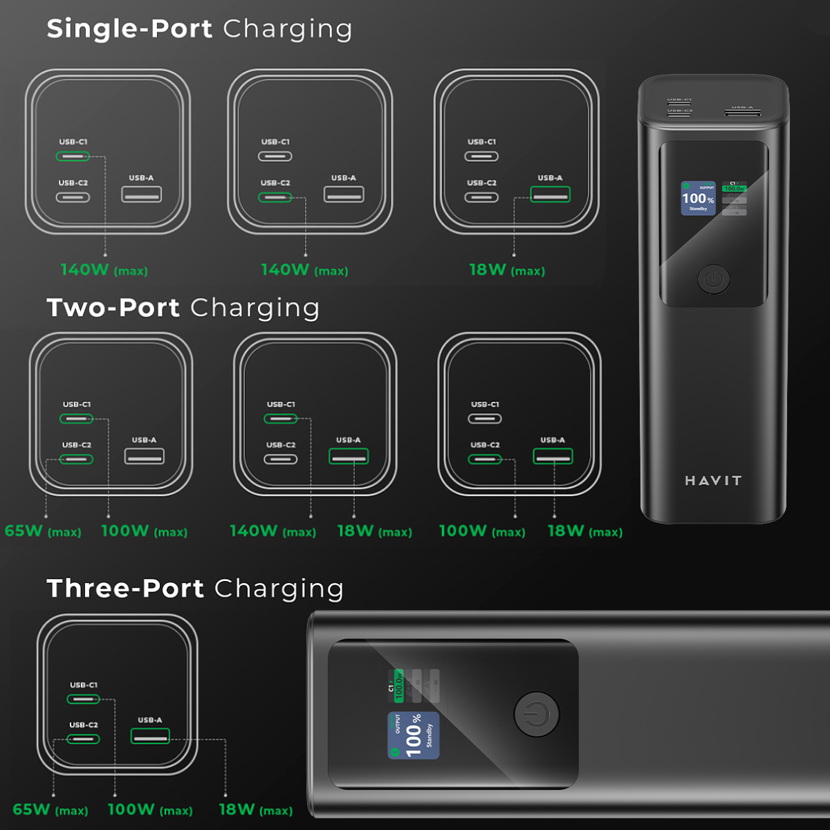 ⢠USB-C1+USB-C2+USB-A: 100W+65W+18W=183W