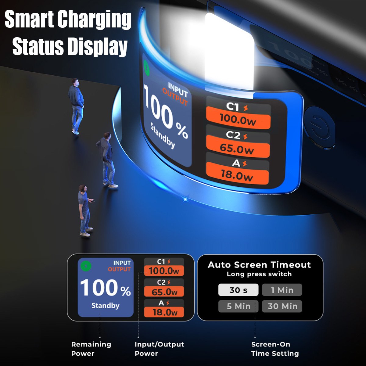 Smart TFT Charging Display: Real-time monitoring of input/output wattage, remaining battery percentage, and screen timeout settings.
