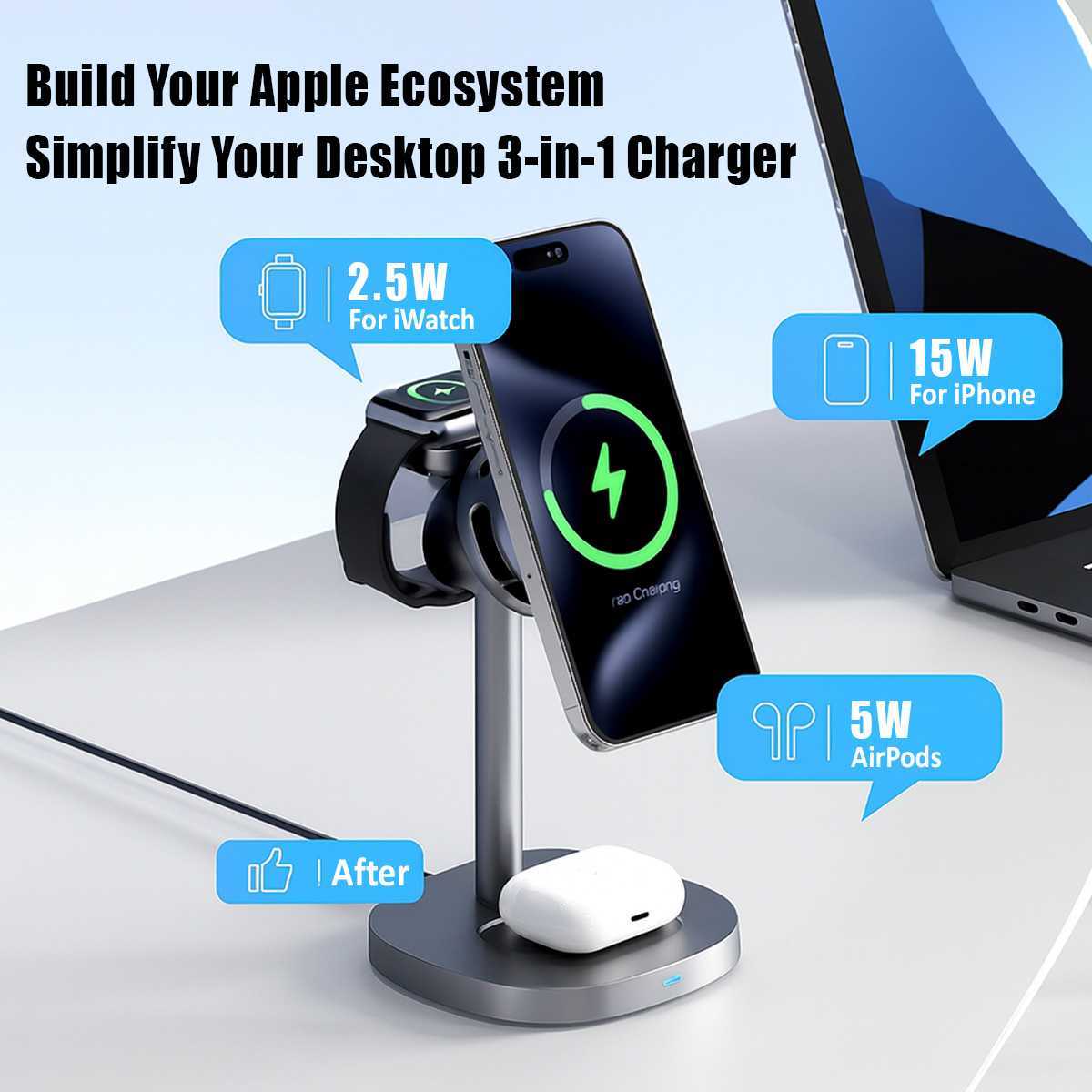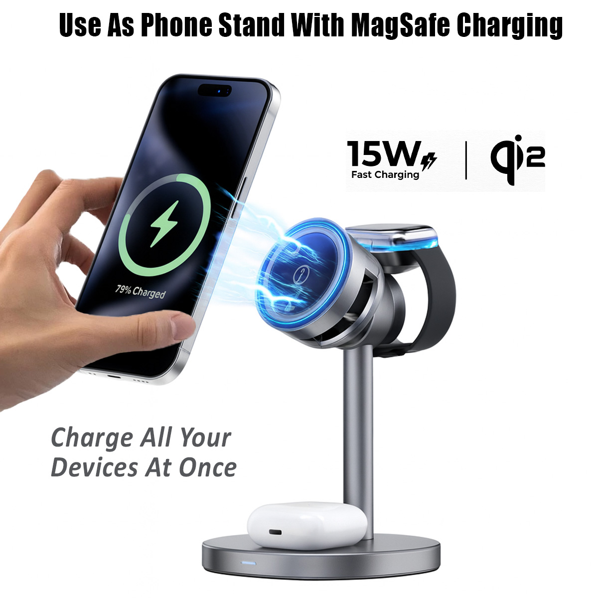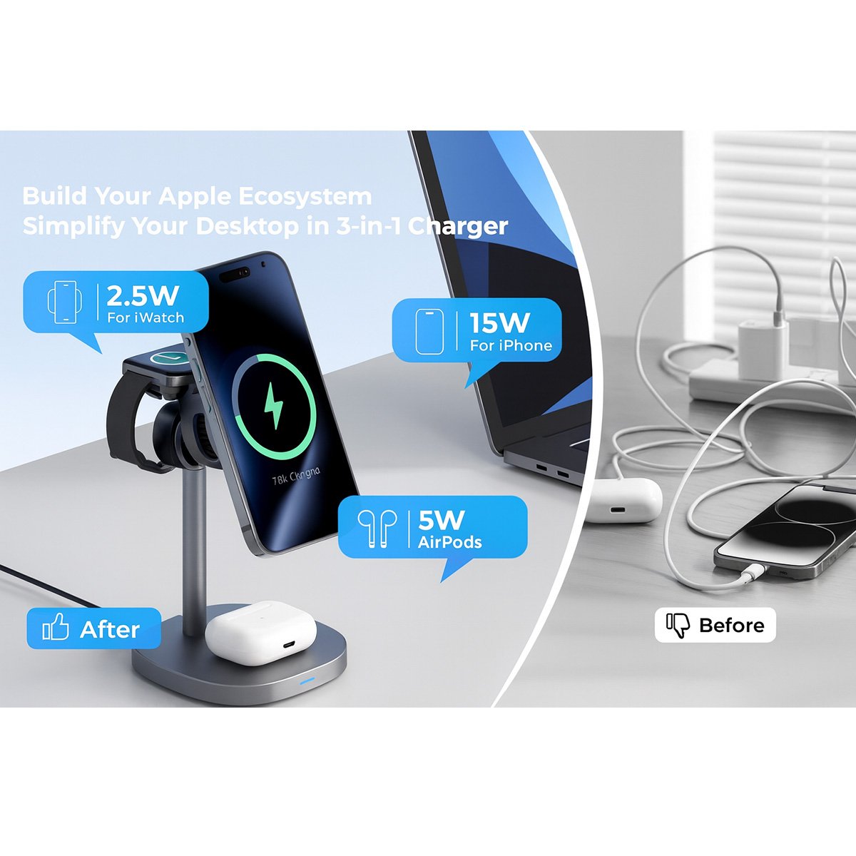 3-in-1 Aluminum Stand: Simultaneously power your iPhone, Apple Watch, and AirPods on a durable, high-end metallic base.
